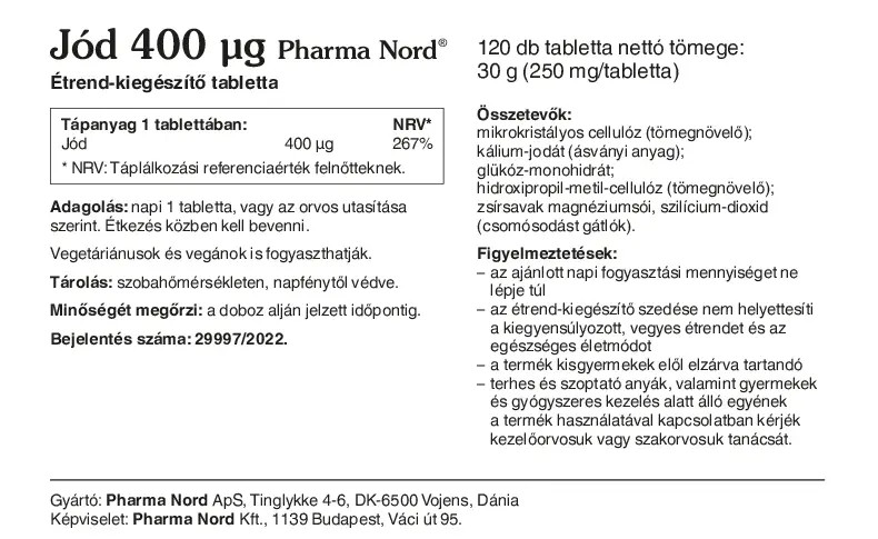 A Jód Pharma Nord kerek, fehér, bevonat nélküli, 8,5 mm átmérőjű tabletta. Minden tabletta 400 mikrogramm kálium-jodátból származó jódot tartalmaz. A tabletták felnőttek, valamint 11 éves és idősebb gyermekek számára készültek. A tabletták nem tartalmaznak állati eredetű összetevőket, így vegetáriánusok és vegánok számára is alkalmasak.