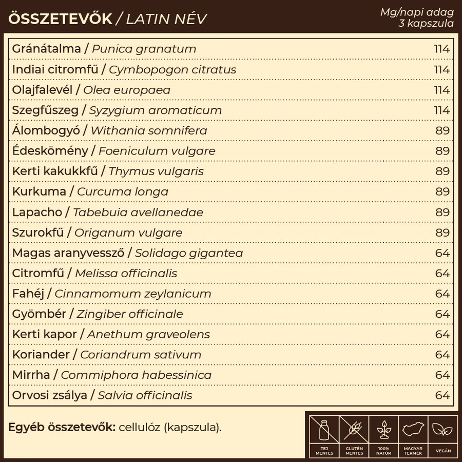A gyógynövény-komplex 18-féle - funkciójában és működésében - egymást támogató, egymás hatását erősítő gyógynövény egysége, mely erős gomba-, baktériumölő és féregűző hatása révén nagyban hozzájárulhat a szervezetben jelen lévő élősködők (férgek, paraziták), gombák kiűzéséhez valamint a Candida-szint természetes mértékű kiegyensúlyozásához.