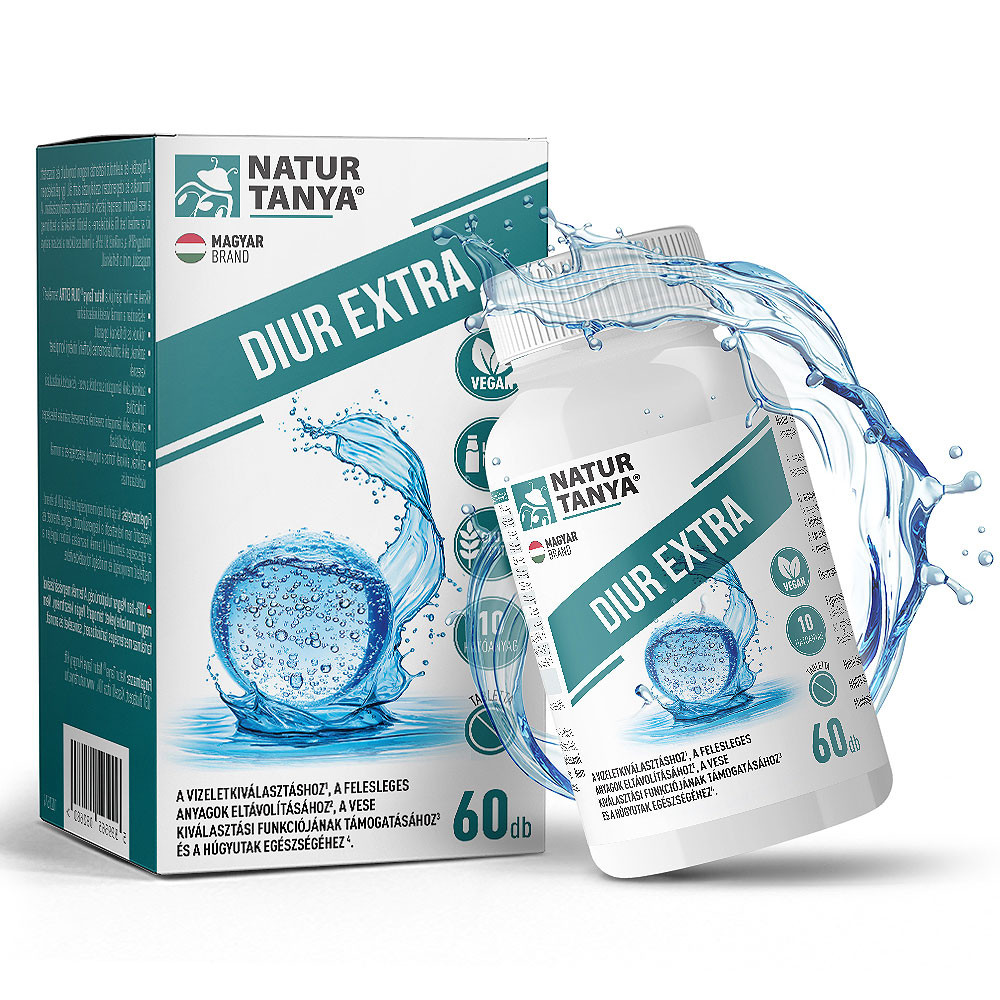 A Natur Tanya DIUR EXTRA 7 féle gyógynövény kivonatot (Közönséges nyírfa levél, Ezüstös hölgymál, Jáva tea levél, Aranyvessző, Tarackbúza gyökértörzs, Mezei zsurló és Gyermekláncfű gyökér) és ásványi anyagokat (kálium, klorid, magnézium-biszglicinát és mikrokapszulázott magnézium-oxid) tartalmazó étrend-kiegészítő tabletta, a vizeletkiválasztáshoz, a felesleges anyagok eltávolításához, a vese kiválasztási funkciójának támogatásához és a húgyutak egészségéhez.