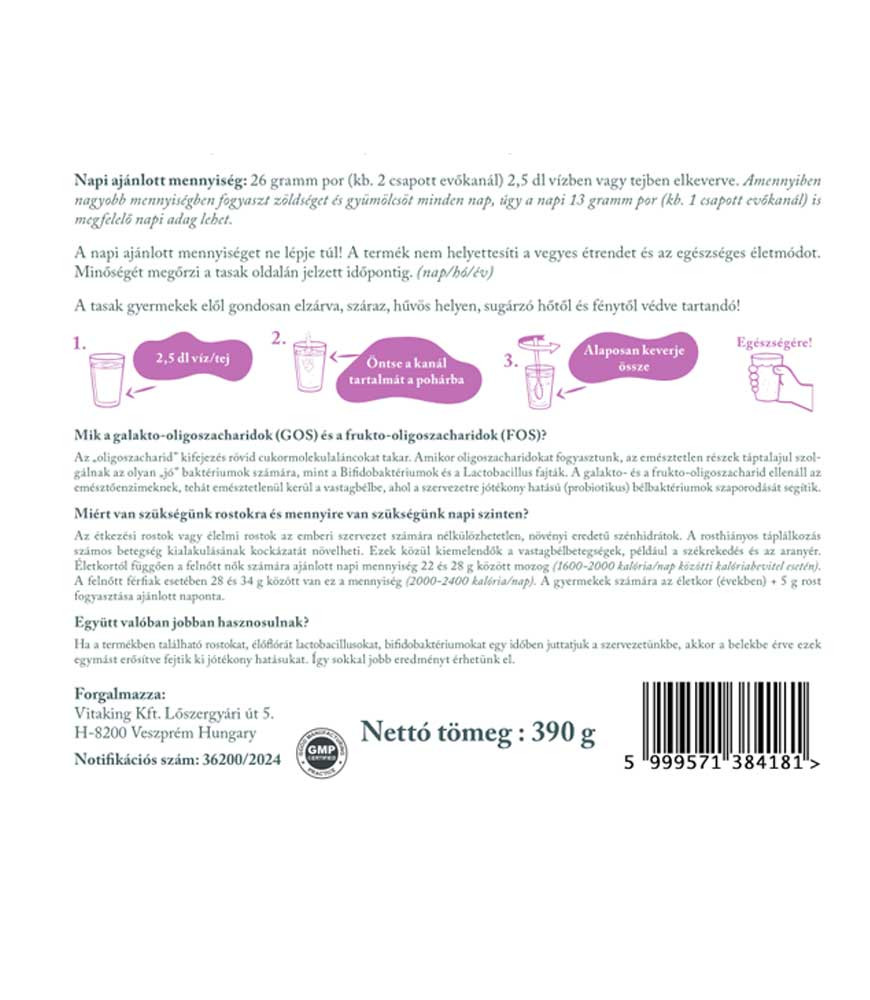 Könnyen oldódik vízben vagy tejben, így egyszerűen beépíthető a napi rutinba. Kifejezetten ajánlott azok számára, akik odafigyelnek a bélflóra egyensúlyára, valamint egy hozzáadott cukor mentes, élőflórás és rostos étrend-kiegészítőt keresnek. Tartósítószer- és mesterséges színezékmentes, prémium minőségű összetevőkből készült.