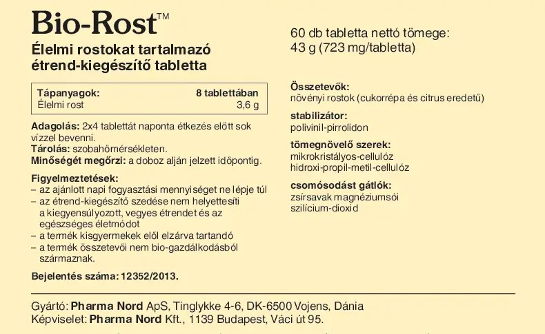 A Bio-Rost étrend-kiegészítő nem tartalmaz hozzáadott tápanyagokat. Minden tabletta 460mg felszívódó és nem felszívódó élelmi rost keverékét tartalmazza, melyet az citrus pektinjéből és cukorrépából állítanak elő, a bélműködés javítása érdekében.