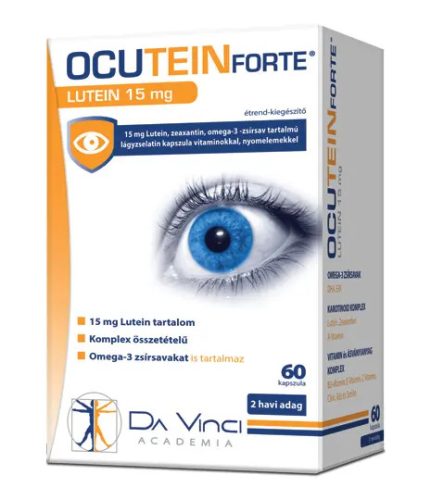 Az OCUTEIN FORTE készítmény 15 mg luteint, többszörösen telítetlen omega-3 zsírsavakat, A-, B2-, C- és E-vitaminokat, valamint cink, réz és szelén nyomelemeket tartalmaz. A készítmény jelentős DHA (dokozahexaénsav) és EPA (eikozapentaénsav) tartalmú halolajjal készült. A DHA a retina szerkezetének része, így szerepet játszik a normál látás fenntartásában. A karotinoidokhoz tartozó lutein és zeaxantin főként a makula luteában találhatók magas koncentrációban, a makula alkotóelemei. A C- és E-vitamin, a cink, réz és szelén nyomelemek hozzájárulnak a sejtek oxidatív stressz elleni védelméhez. Az A- és B2-vitaminoknak a normál látás fenntartásában van szerepük.