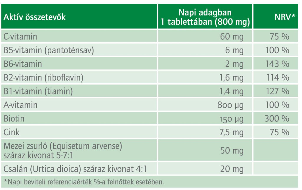 A-, B- és C-vitaminokkal, biotinnal és cinkkel a haj, bőr, köröm ápolásáért.