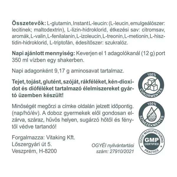 Vitaking Aminosav hatóanyagok 1 adagban-12 g Mennyiség NRV%