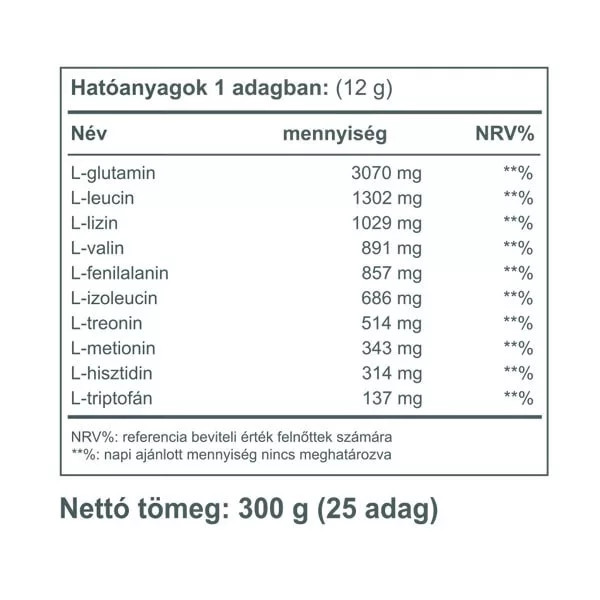 L-glutamin, Instant L-leucin:(L-leucin, emulgeálószer: Lecitinek; maltodextrin), L-lizin-hidroklorid, étkezési sav: citromsav, Aromák, L-valin, L-fenilalanin, L-izoleucin, L-treonin, L-metionin, L-hisztidin-hidroklorid, és L-triptofán, édesítőszer: szukralóz.