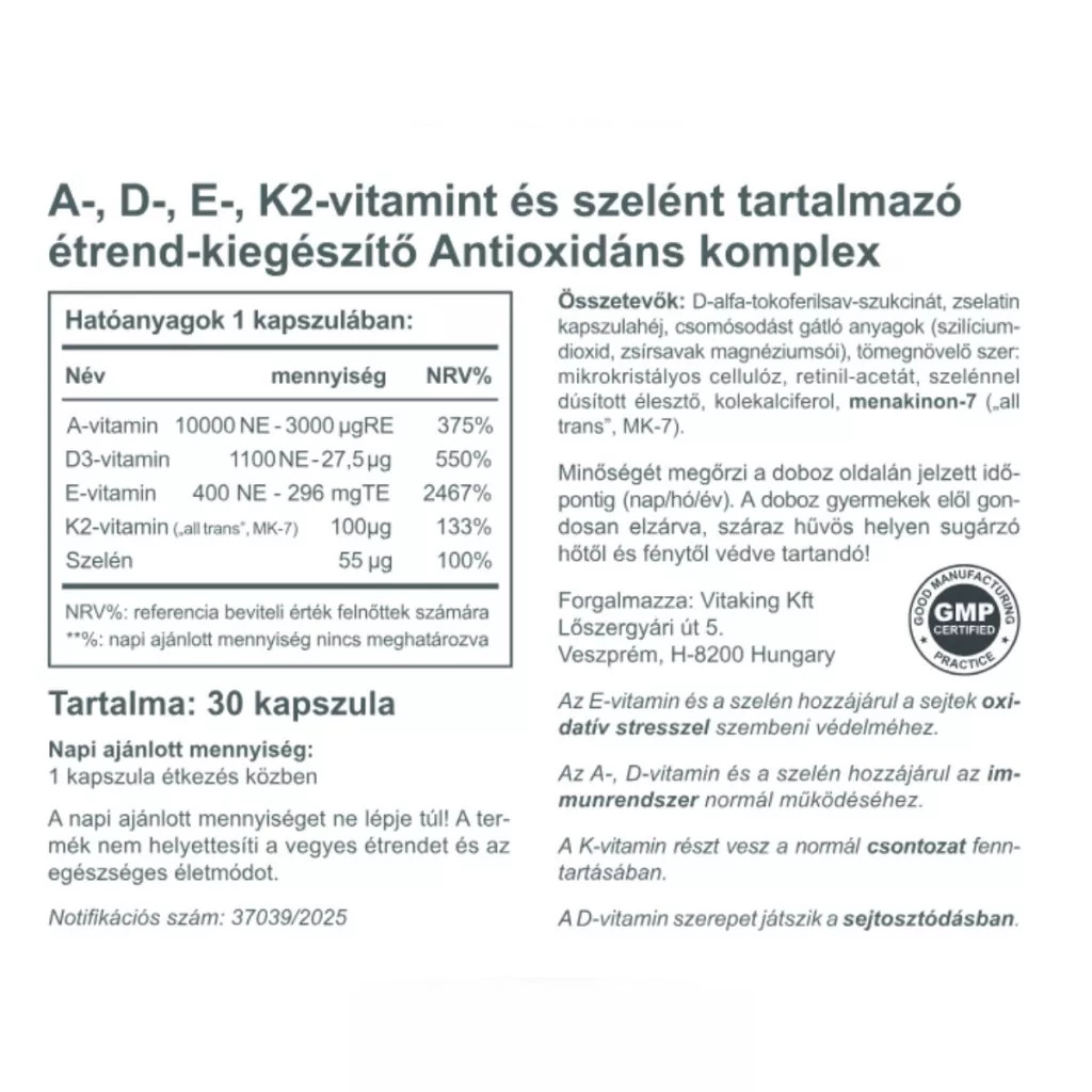 A hétköznapok során számos  tényező állítja kihívás elé a szervezetünket – a feszített tempó, a kevés napfény, a városi levegő vagy a nem mindig kiegyensúlyozott étkezés. A Vitaking Antioxidáns Komplex összetevői kiváló támogatást nyújtanak a sejteknek, a mindennapi terhelések közepette. A-, D3-, E- és K2-vitamin, illetve szelén, gondosan válogatott összetevők, magas hatóanyag-tartalom.