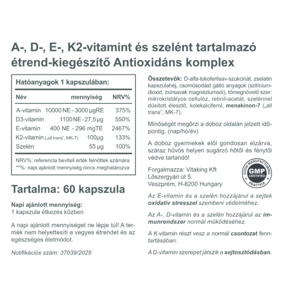 A hétköznapok során számos  tényező állítja kihívás elé a szervezetünket – a feszített tempó, a kevés napfény, a városi levegő vagy a nem mindig kiegyensúlyozott étkezés. A Vitaking Antioxidáns Komplex összetevői kiváló támogatást nyújtanak a sejteknek, a mindennapi terhelések közepette. A-, D3-, E- és K2-vitamin, illetve szelén, gondosan válogatott összetevők, magas hatóanyag-tartalom.