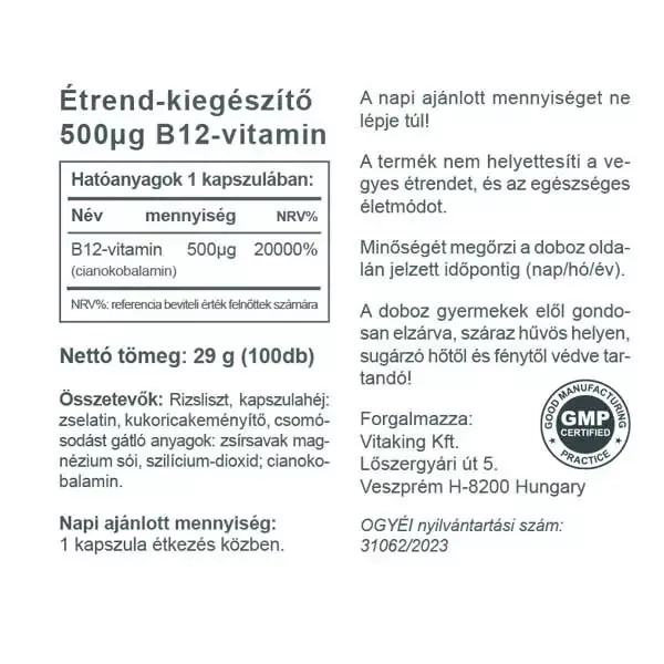 A termék kapszulánként 500 μg (mikrogramm) B12-vitamint tartalmaz, így hatékony támogatást nyújthat mindazoknak, akik szellemi munkát végeznek, aktív életet élnek vagy egyszerűen csak szeretnék megőrizni frissességüket a mindennapokban.