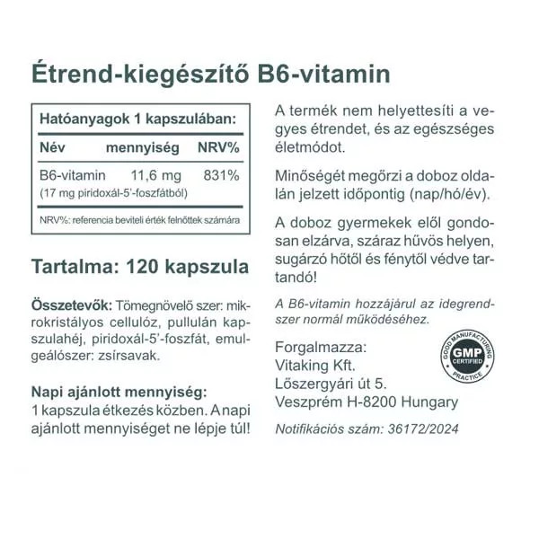 A készítmény kapszulánként 11,6 mg B6-vitamint tartalmaz (17 mg piridoxál-5’-foszfátból) így segíti a szervezet optimális támogatását a stresszes vagy megterhelő időszakokban.