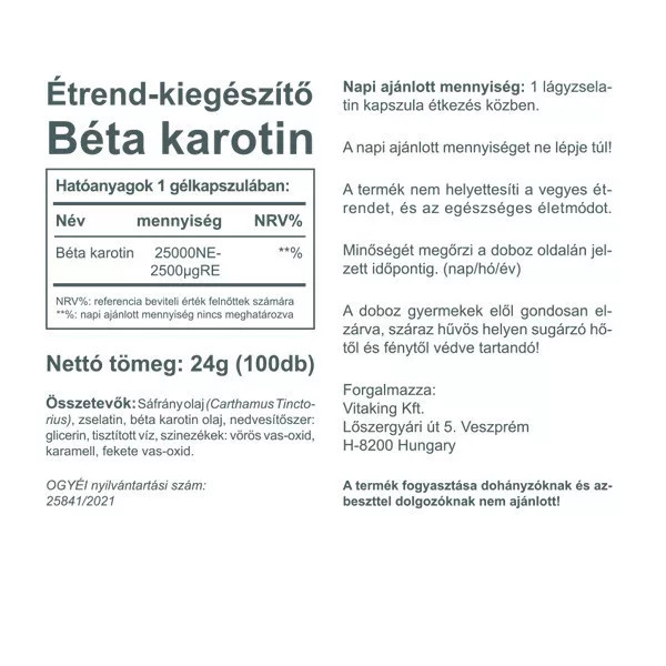 Ez a narancssárga növényi pigment – többek között a sárgarépa, az édesburgonya, a sütőtök és a sárgabarack színéért felelős – az A-vitamin elővitaminjaként működik: vagyis szervezetünk képes belőle annyi A-vitamint előállítani, amennyire éppen szüksége van.