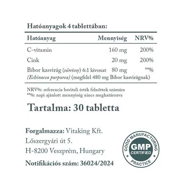 Napi adagja (4 tabletta) 160mg C-vitamint, 20mg cink-biszglicinátot, és 80mg kasvirág kivonatot (megfelel 480 mg Bíbor kasvirágnak) tartalmaz.