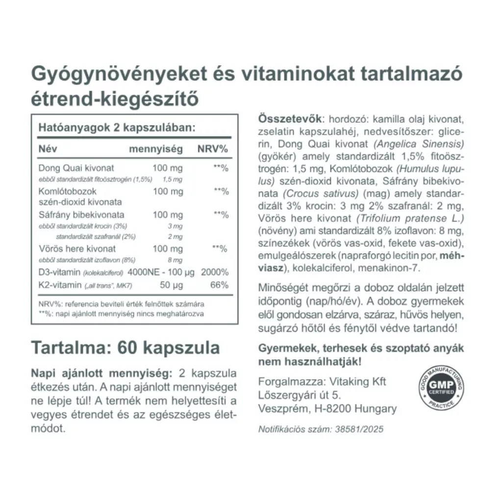A Vitaking elkötelezett a tiszta összetétel mellett. A kapszulák ellenőrzött forrásból származó, standardizált hatóanyagokat tartalmaznak, biztosítva a minden egyes adagban elvárható minőséget. A termék kiváló választás azoknak a hölgyeknek, akik kerülik a mesterséges adalékanyagokat és a természetes megoldásokat részesítik előnyben.