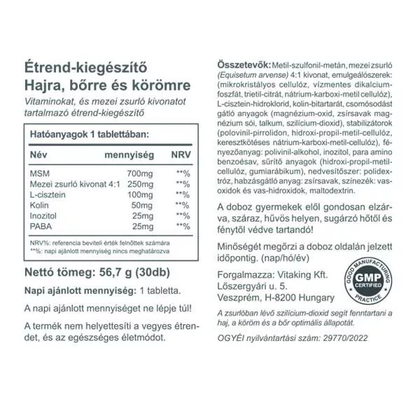 Ez a gondosan összeállított formula olyan értékes összetevőket tartalmaz, mint a mezei zsurló, az MSM, a kolin, az inozitol és az L-cisztein. A zsurlóban található szilícium-dioxid hozzájárul a haj, a köröm és a bőr egészségének megőrzéséhez, míg a többi összetevő harmonikusan egészíti ki a mezei zsurló erejét.
