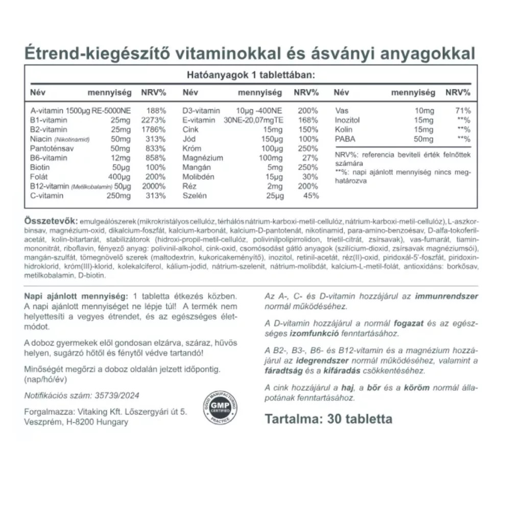 A Vitaking multivitaminja egy igazán komplex készítmény, összesen 26-féle vitamint, ásványi anyagot, nyomelemet, és egyéb létfontosságú tápanyagokat tartalmaz.