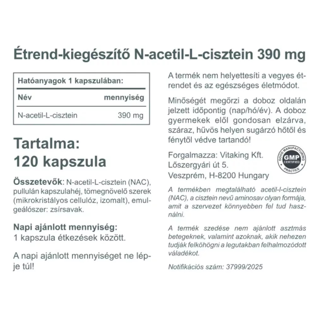 Vitaking N-acetil-L-cisztein kapszulánként 390 mg hatóanyagtartalommal. A termék 100%-ban vegán, növényi kapszulahéjjal, és GMP-minősített üzemben készül, szigorú gyártási szabályozás mellett.