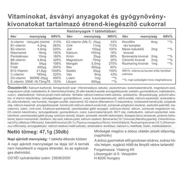 • Teljes vitamin-spektrum – A-tól K-ig, minden fontos vitamin, köztük jól hasznosuló B-vitaminok, C-vitamin az immunrendszer támogatásáért, D3-vitamin az egészséges csontokért és izmokért, valamint E- és K2-vitamin a sejtvédelemért és a csontozatért.